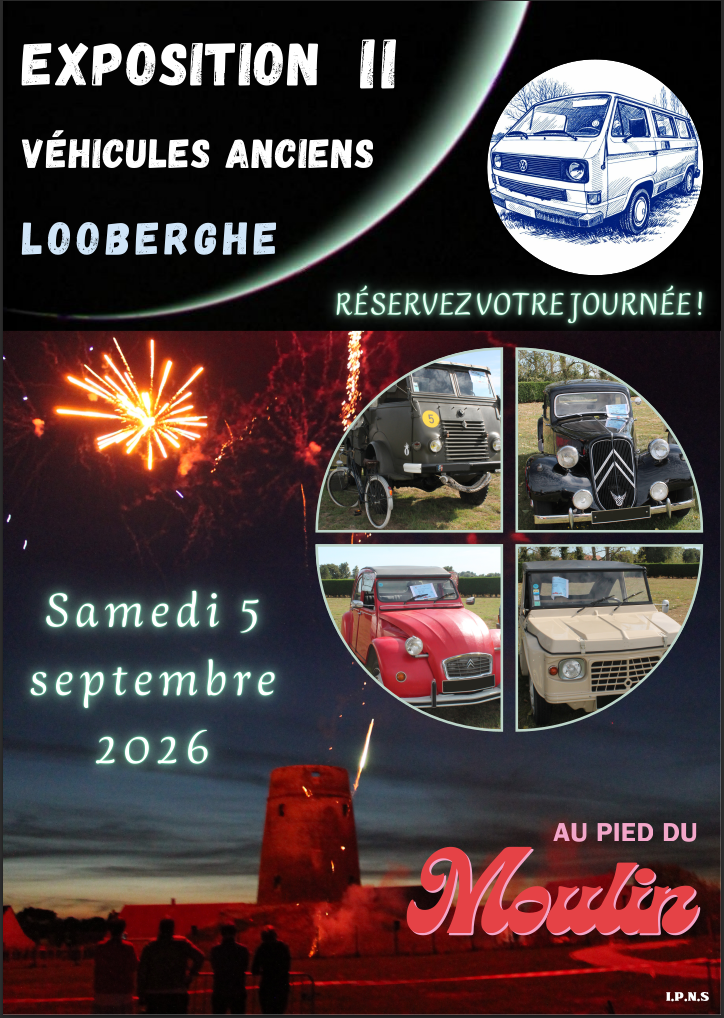 Le Comité des Fêtes de Looberghe organise sa 2ème exposition de voitures anciennes le samedi 5 septembre 2026 de 10h à 18h au pied du moulin : city stade et/ou école Marcel Valcke. Si vous êtes intéressés, merci de bien vouloir remplir le bulletin ci-contre avant le 30 juillet 2026. N’hésitez-pas à nous contacter pour plus d’informations.
